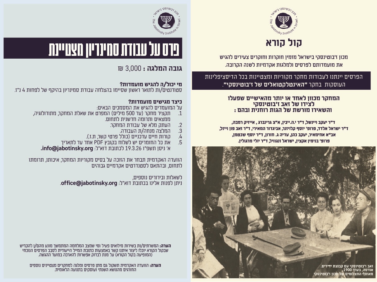 למלגות ופרסי מכון ז'בוטינסקי ניתן לגשת עד א' בניסן תשפ"ו (19 במרץ 2026)